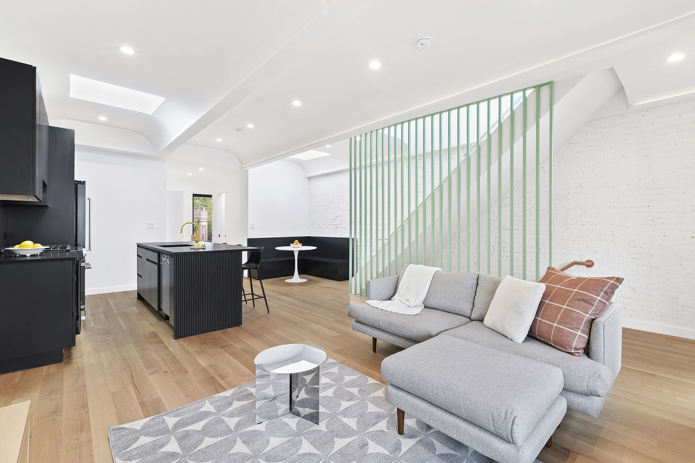 The existing building was found in significant disrepair with evidence of multiple construction projects having taken place over the years. Overlay Office gutted the building while also preserving much of the exterior as a nod to adjacent residences and the traditional New York City townhouse typology. The historic brick wall and cornice on the front exterior were retained but updated with two shades of black paint and graphic scalloped projections—a reference to the arched windows and roofs commonly found in the neighborhood.